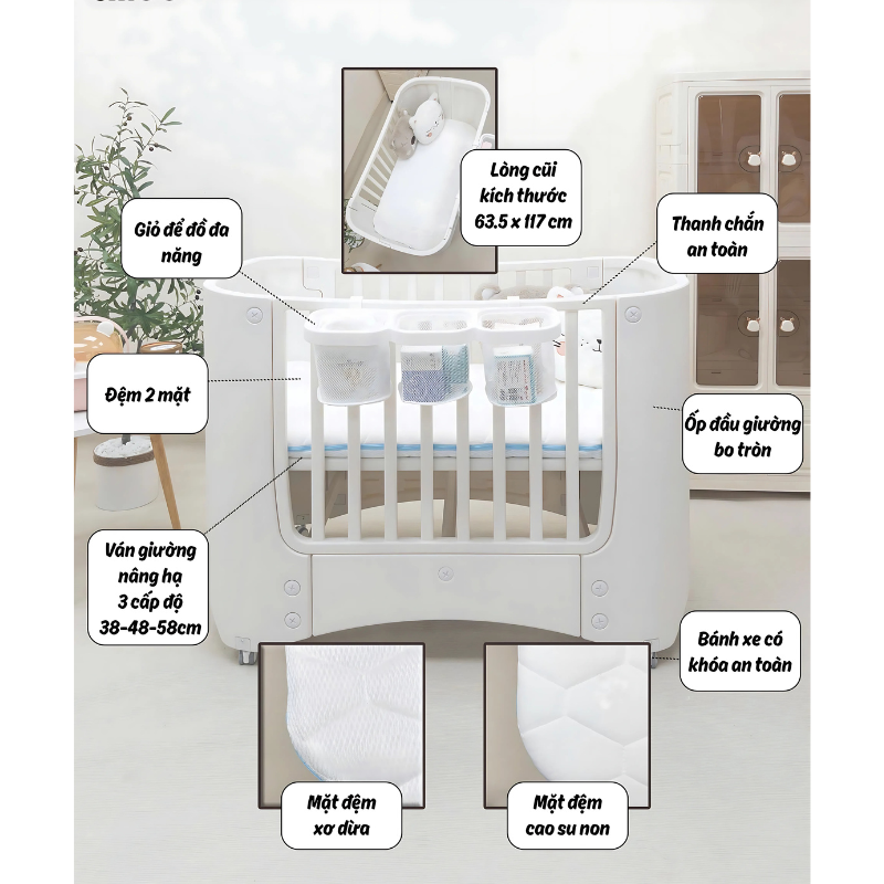 - Đệm nằm 2 mặt làm từ xơ dừa và cao su non, tùy chỉnh phù hợp với từng độ tuổi phát triển của bé, nâng đỡ và bảo vệ cột sống khoa học