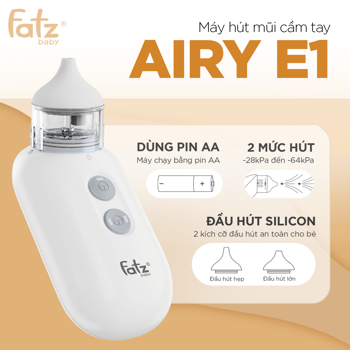 Airy E1 hoạt động dựa trên cơ chế hút áp lực vừa đủ, an toàn cho trẻ em, đi kèm đầu hút silicon mềm mại, thân thiện với làn da mỏng manh của bé. Máy sử dụng pin AA tiện lợi, dễ dàng thay thế, với thời gian sử dụng lâu dài và hiệu quả. Đặc biệt, sản phẩm có khả năng hút mạnh với áp suất tối đa -68 kPa, giúp loại bỏ dịch nhầy nhanh chóng nhưng vẫn êm ái với độ ồn ≤70 dBA, không gây khó chịu cho bé.
