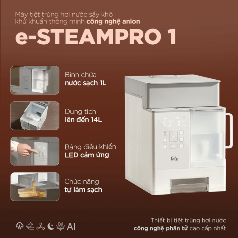 Mong muốn mang đến sự bảo vệ tuyệt đối cho con, Fatzbaby tự hào giới thiệu e-SteamPro 1 – chiếc máy tiệt trùng hơi nước công nghệ cao đi đầu thị trường về công nghệ tiệt trùng hơi nước, được thiết kế để thiết lập một chuẩn mực hoàn toàn mới trong chăm sóc bé yêu. Đây không chỉ là một thiết bị, mà là biểu tượng của sự đổi mới và sự an tâm tuyệt đối.