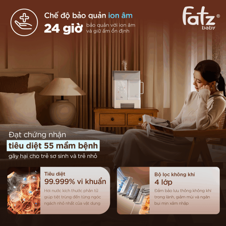 - Ứng dụng công nghệ hơi nước phân tử siêu mịn khác biệt, len lỏi đến từng ngóc ngách để triệt tiêu vi khuẩn toàn diện, mở ra kỷ nguyên mới về công nghệ tiệt trùng hơi nước kết hợp AI điều chỉnh sấy khô theo môi trường và chế độ tiệt trùng ba cấp độ từ nhanh đến chuyên sâu, kết hợp ion âm để nhân đôi hiệu quả tiệt trùng, khử mùi cho mọi vật dụng của bé.