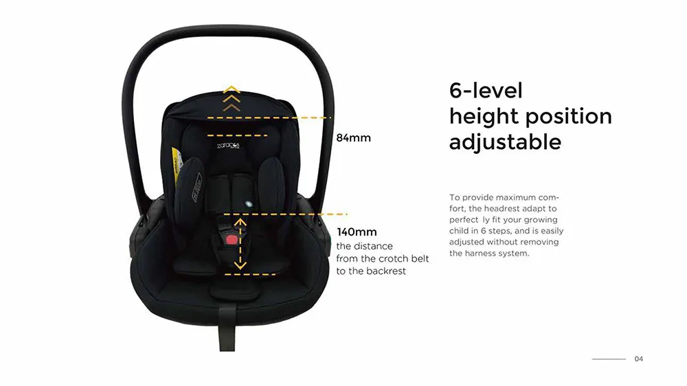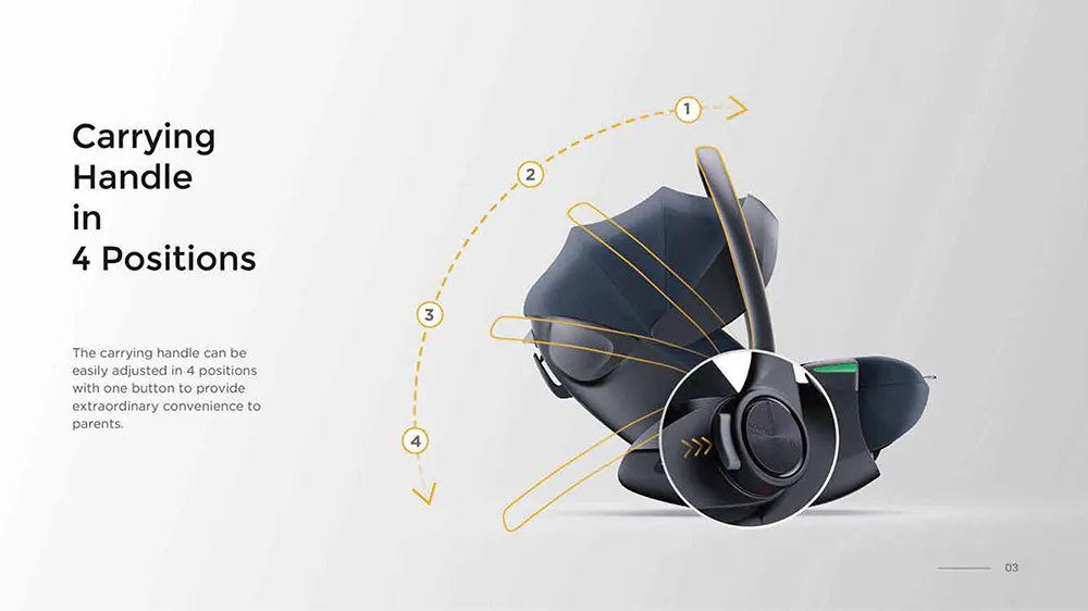 - Tay xách của ghế có thể điều chỉnh 4 vị trí khác nhau, phù hợp cho việc xách ghế, đặt ghế cố định hoặc dùng làm điểm tựa khi bé ngủ. Tất cả chỉ với một nút bấm, giúp bố mẹ thao tác nhanh gọn và thuận tiện hơn trong mọi hoàn cảnh.