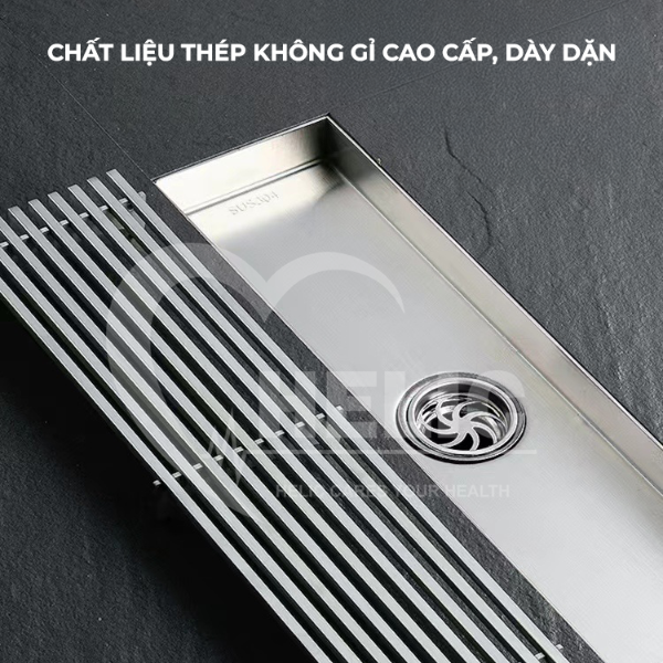 - Phễu thoát sàn dài inox 304 với thiết kế chắc chắn, chống gỉ sét, thoát nước nhanh và mang lại vẻ sang trọng cho không gian phòng tắm.