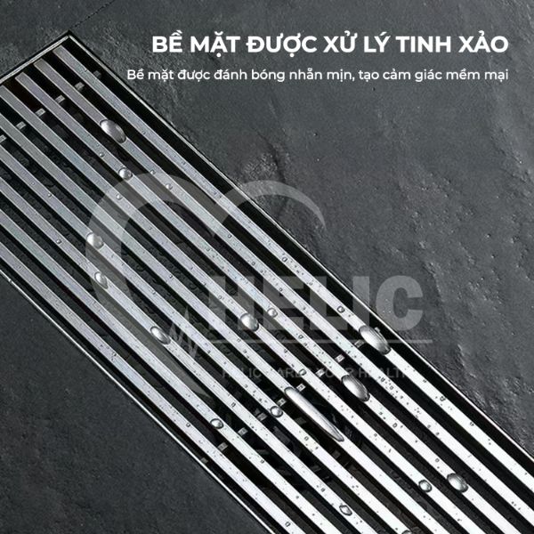 - Phễu thoát sàn dài inox 304 với thiết kế chắc chắn, chống gỉ sét, thoát nước nhanh và mang lại vẻ sang trọng cho không gian phòng tắm.