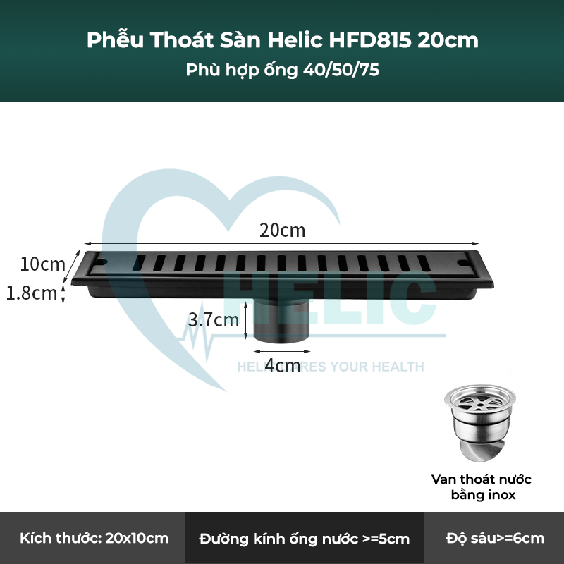 - Tên sản phẩm: Phễu thoát sàn Helic HFD815 20x10cm