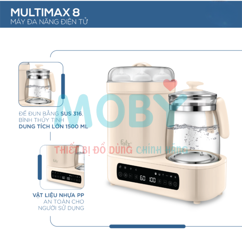 Máy đa năng điện tử Fatzbaby Multimax 8 là giải pháp tuyệt vời cho các mẹ bỉm hiện đại, tích hợp nhiều chức năng trong một thiết bị duy nhất như tiệt trùng, hâm sữa, hấp, nấu cháo, xay nhuyễn… Sản phẩm được thiết kế nhỏ gọn, tiện lợi, giúp mẹ tiết kiệm thời gian và không gian, đồng thời hỗ trợ chăm sóc bé yêu an toàn, khoa học và dễ dàng hơn.